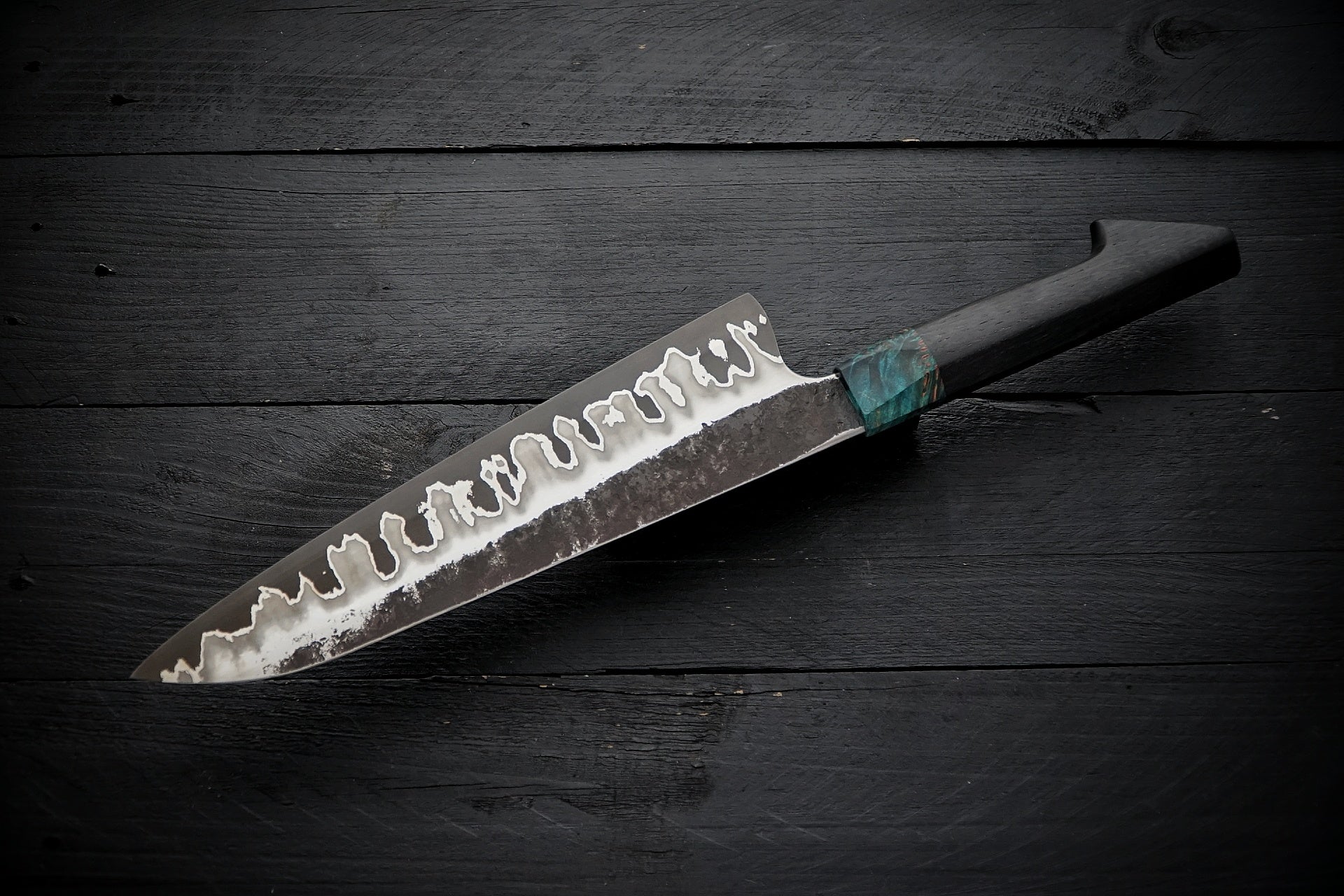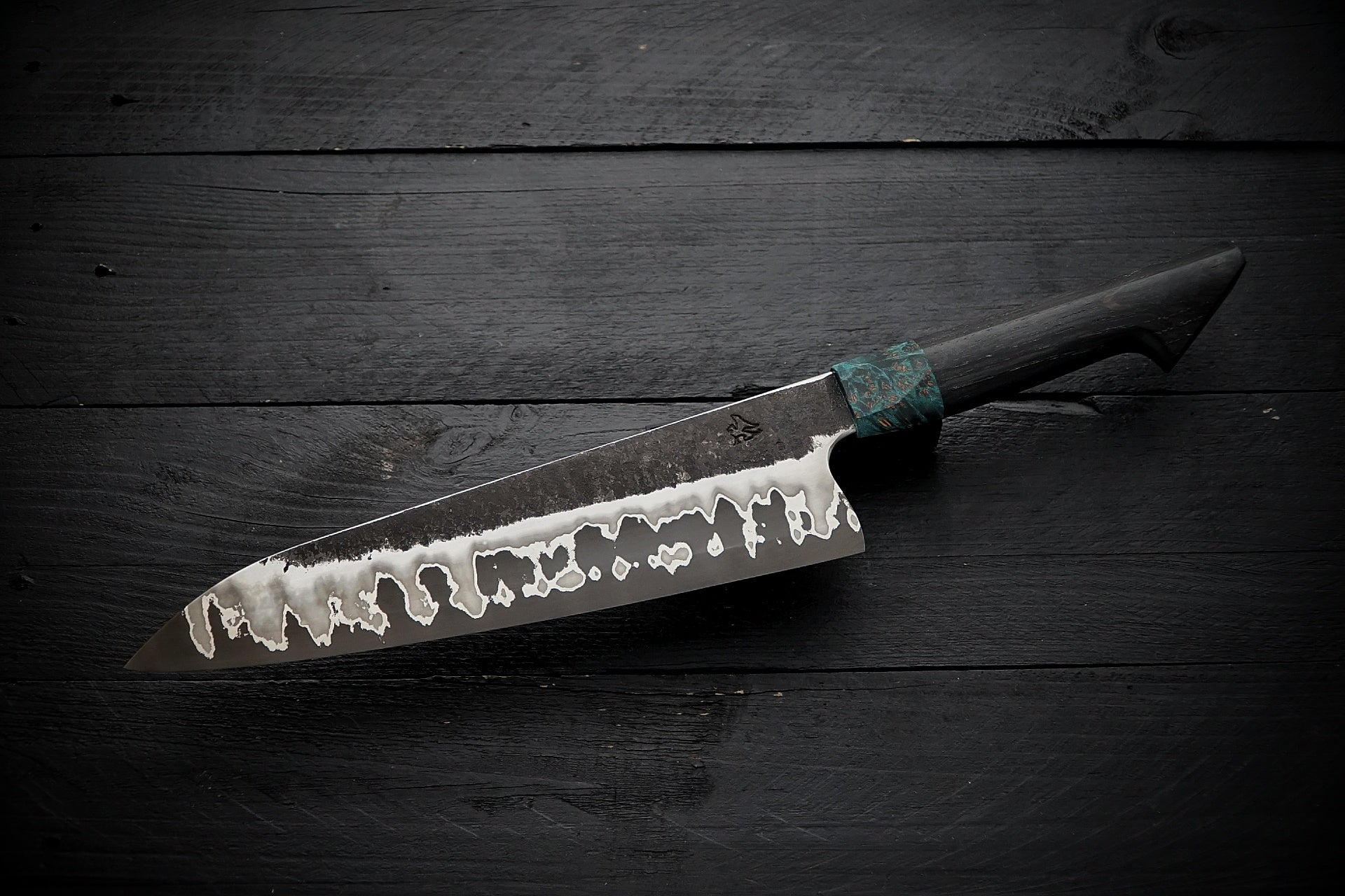 Forged from 52100 carbon steel for the cutting edge with stainless/nickel cladding. 52100 is used to manufacture industrial cutters, automotive and aircraft components as it has great toughness and durability. Carbon steel holds a very fine durable edge but will patina and should be dry stored when not in use. The gyuto style blade is great for covering most tasks in the kitchen and features a concave “S-grind” to reduce surface area and improve food release. The handle wood has been stabilized in a resin to resist moisture and increase durability.