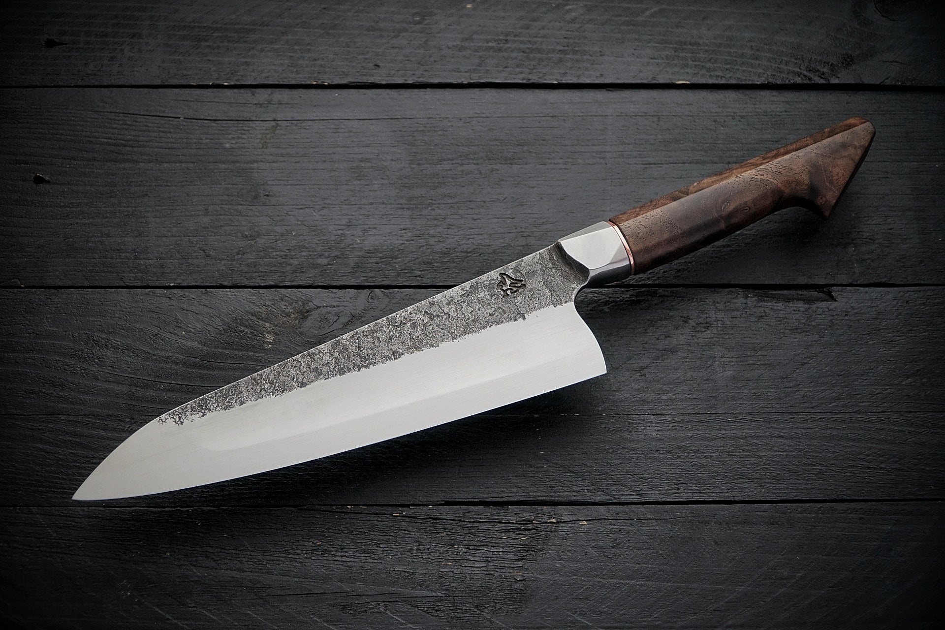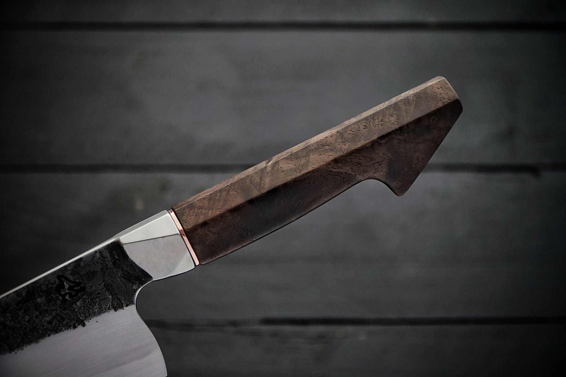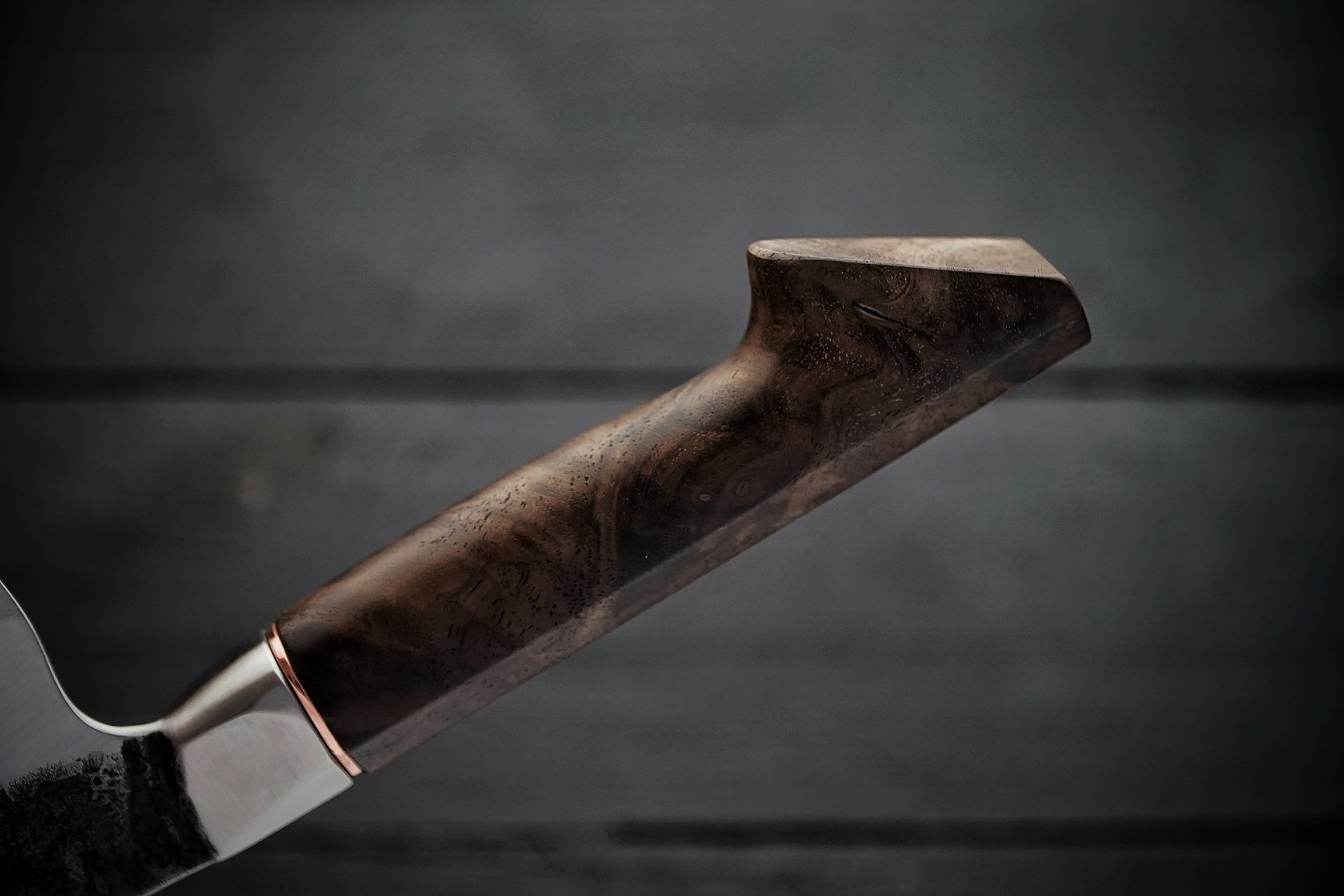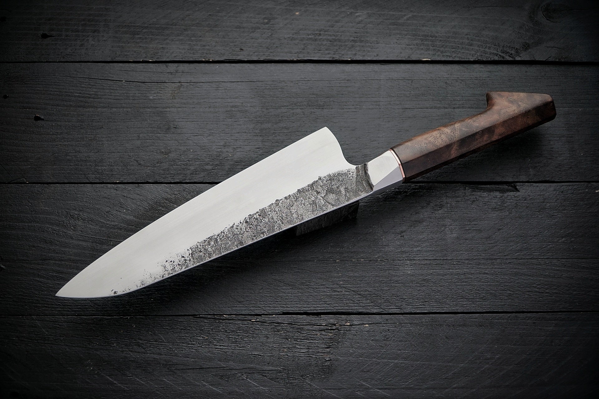 Forged from a single bar of 52100 carbon steel to form the blade and bolster for an extremely strong construction with an heirloom fit (rounded edges between wood/steel). The gyuto style blade is great for covering most tasks in the kitchen and features a concave “S-grind” to reduce surface area and improve food release. The handle wood has been stabilized in a resin to resist moisture and increase durability.