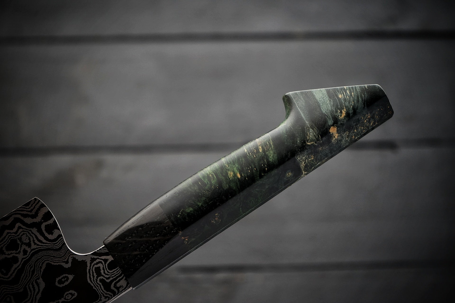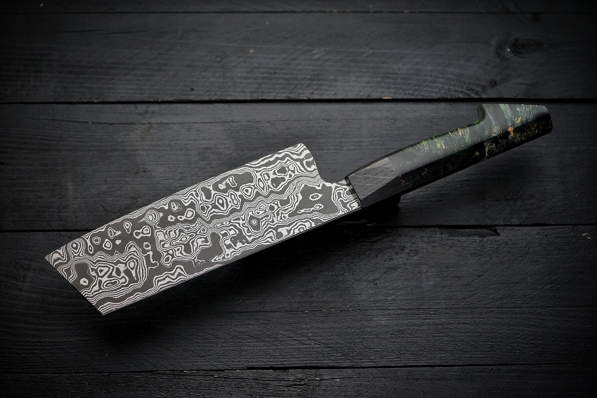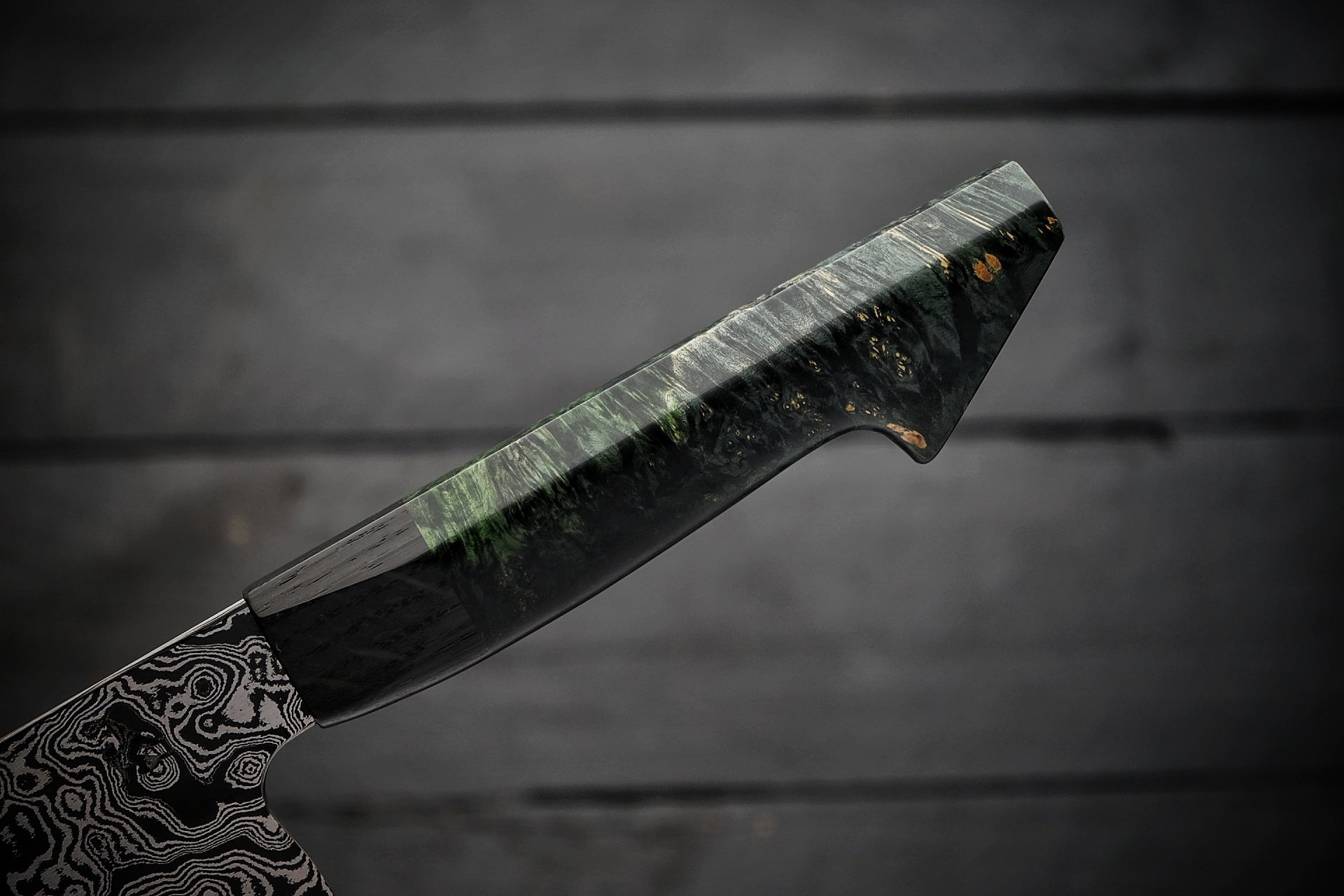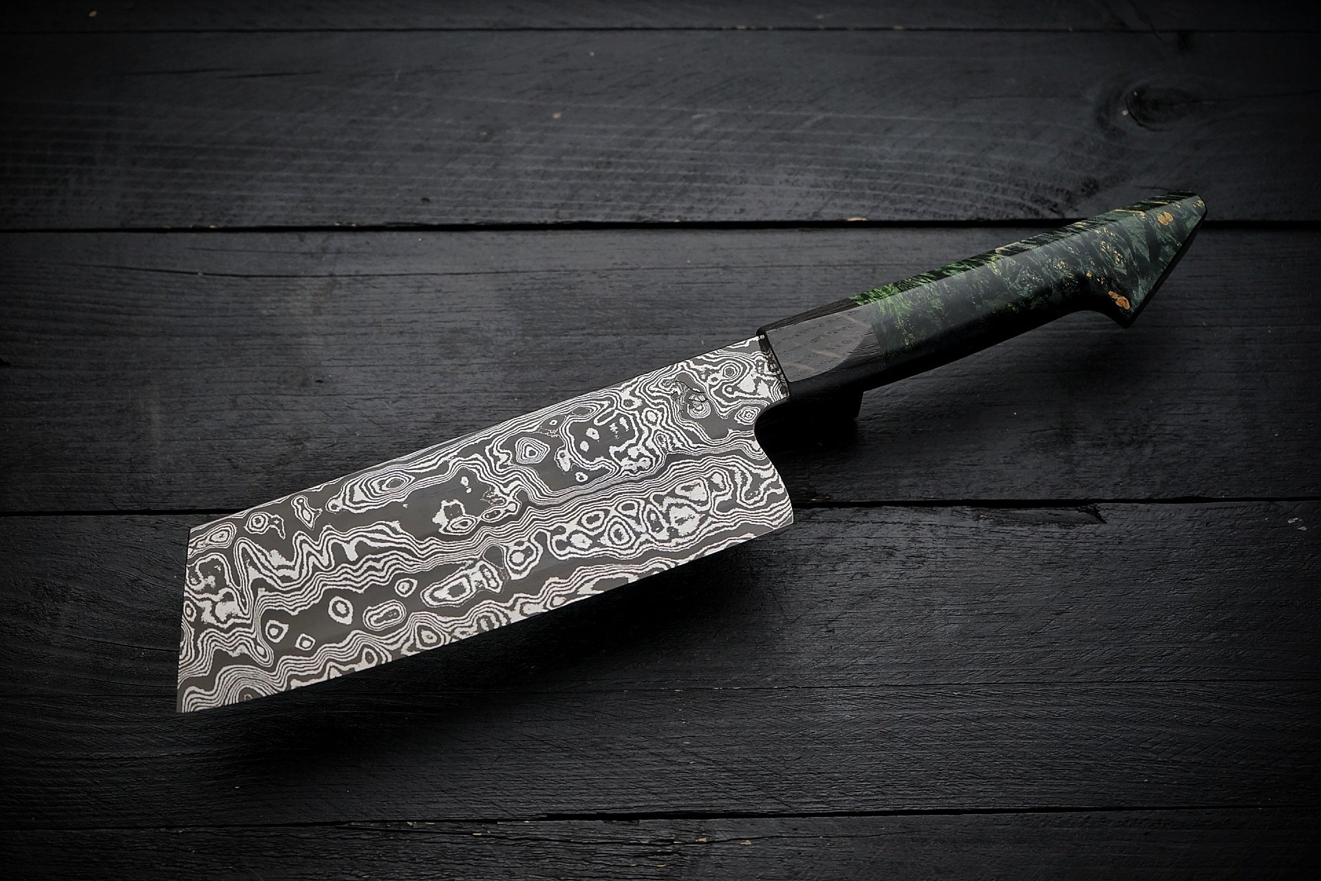 Forged from 1095/15n20 carbon steel in a random pattern damascus. High polished finish on the steel for extra contrast. Carbon steel holds a very fine durable edge but will patina and should be dry stored when not in use. The Bunka style blade is great for processing veg while covering most tasks in the kitchen and features a concave “S-grind” to reduce surface area and improve food release. The handle wood has been stabilized in a resin to resist moisture and increase durability.