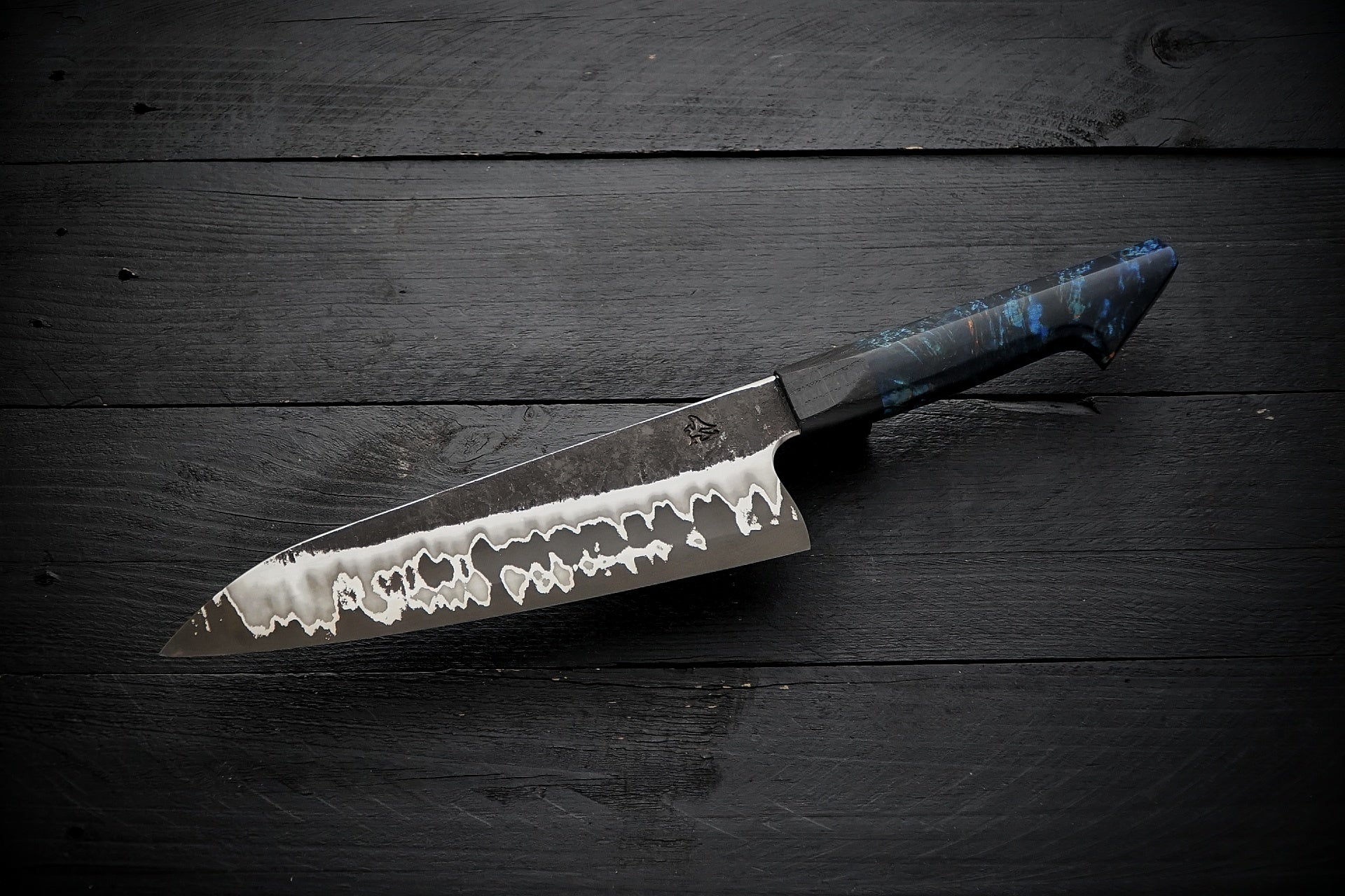 Forged from 52100 carbon steel for the cutting edge with stainless/nickel cladding. 52100 is used to manufacture industrial cutters, automotive and aircraft components as it has great toughness and durability. Carbon steel holds a very fine durable edge but will patina and should be dry stored when not in use. The gyuto style blade is great for covering most tasks in the kitchen and features a concave “S-grind” to reduce surface area and improve food release. The handle wood has been stabilized in a resin to resist moisture and increase durability.