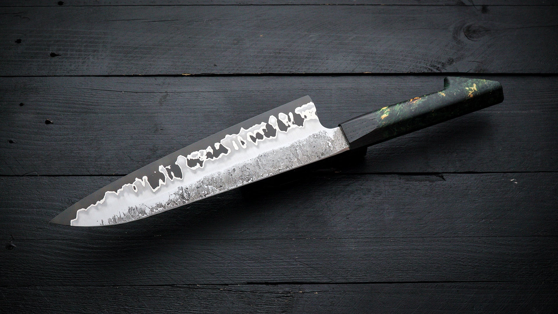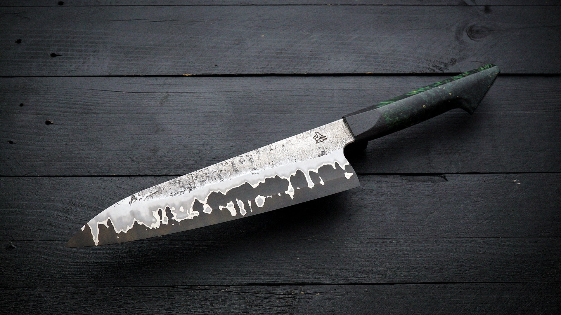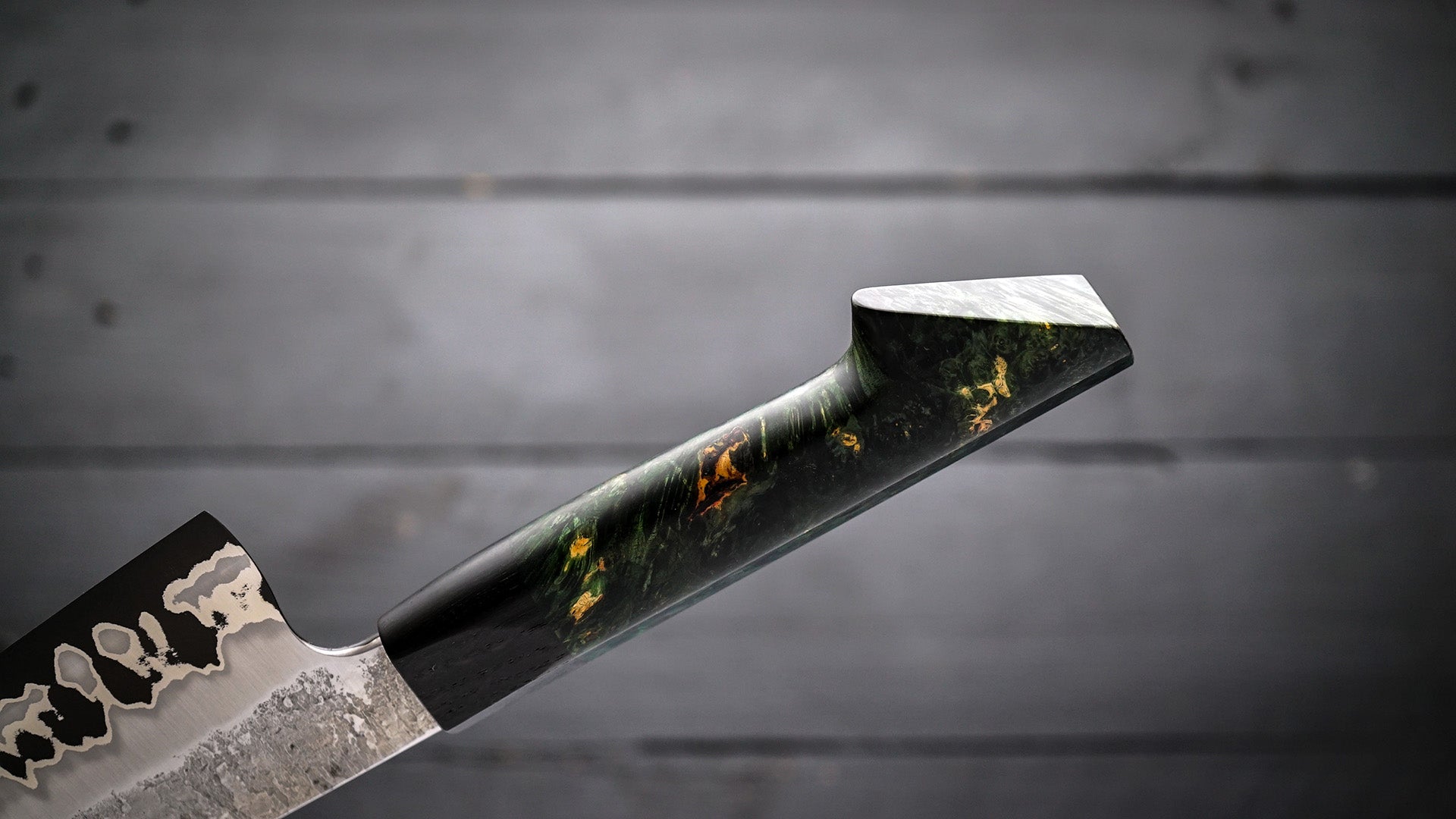 Forged from 52100 carbon steel for the cutting edge with stainless/nickel cladding. 52100 is used to manufacture industrial cutters, automotive and aircraft components as it has great toughness and durability. Carbon steel holds a very fine durable edge but will patina and should be dry stored when not in use. The gyuto style blade is great for covering most tasks in the kitchen and features a concave “S-grind” to reduce surface area and improve food release. The handle wood has been stabilized in a resin to resist moisture and increase durability.