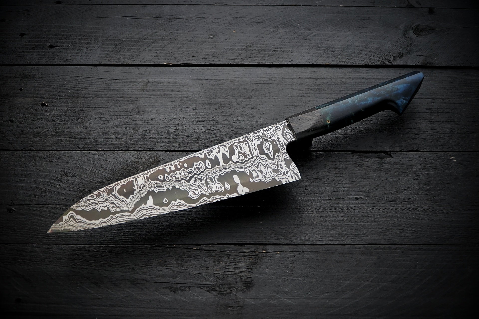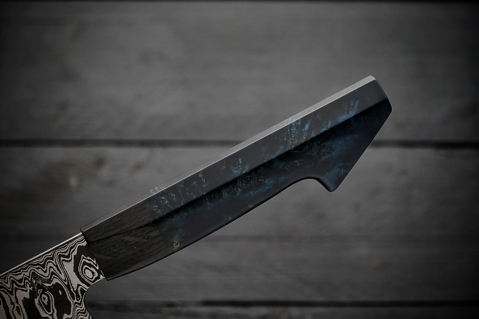 Forged from 1095/15n20 carbon steel in a random pattern damascus. High polished finish on the steel for extra contrast. Carbon steel holds a very fine durable edge but will patina and should be dry stored when not in use. The Gyuto style blade is great for covering most tasks in the kitchen and features a concave “S-grind” to reduce surface area and improve food release. The handle wood has been stabilized in a resin to resist moisture and increase durability.