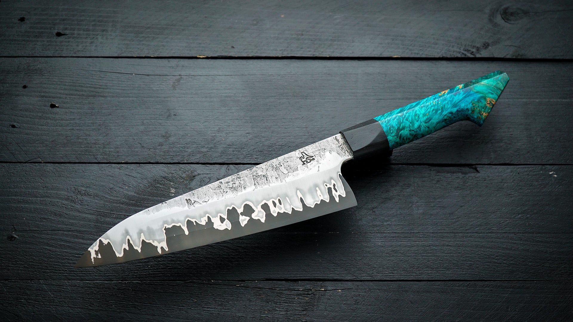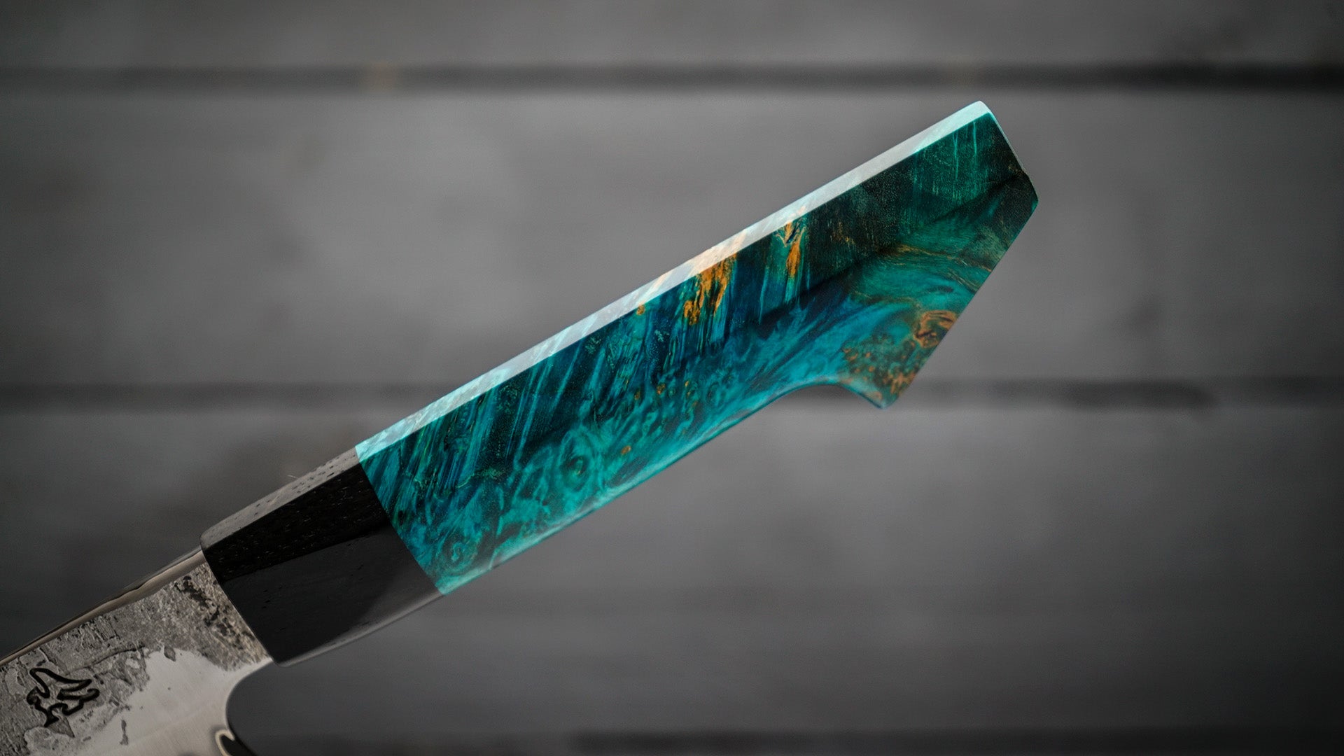 Forged from 52100 carbon steel for the cutting edge with stainless/nickel cladding. 52100 is used to manufacture industrial cutters, automotive and aircraft components as it has great toughness and durability. Carbon steel holds a very fine durable edge but will patina and should be dry stored when not in use. The gyuto style blade is great for covering most tasks in the kitchen and features a concave “S-grind” to reduce surface area and improve food release. The handle wood has been stabilized in a resin to resist moisture and increase durability.