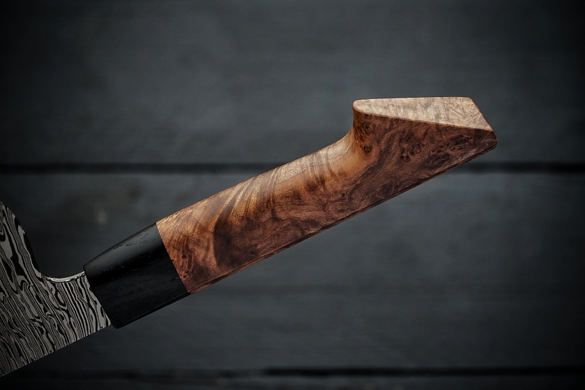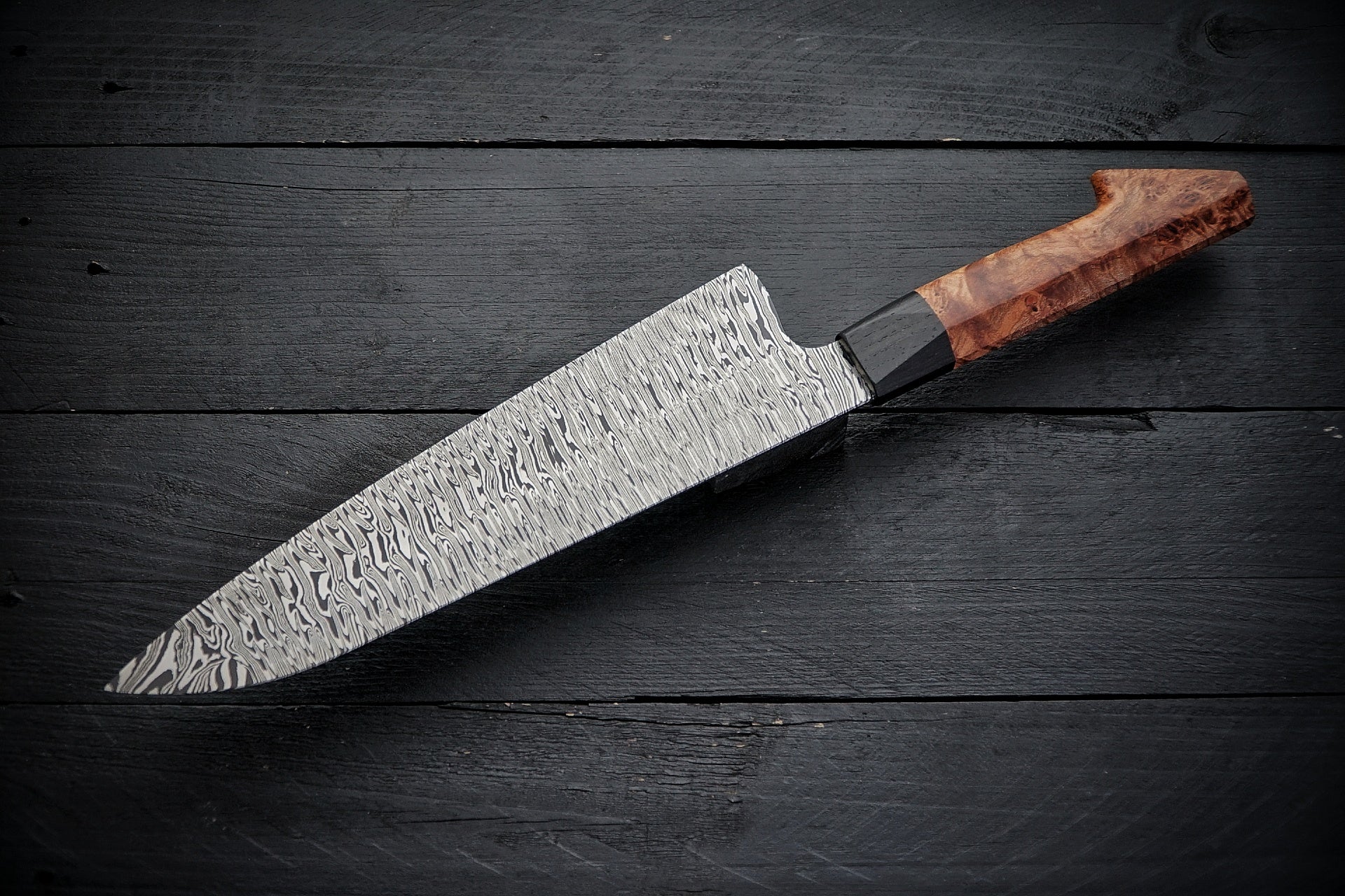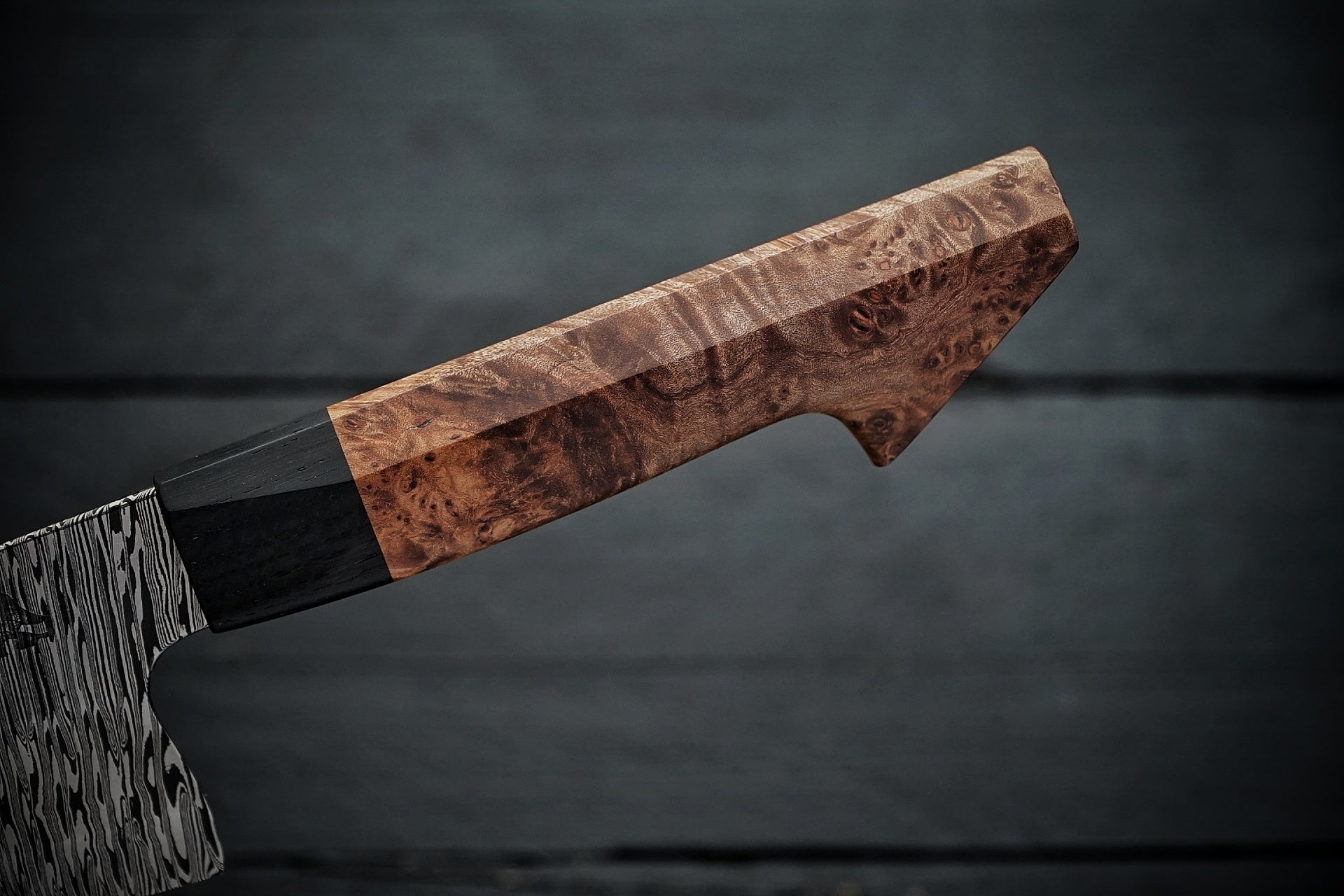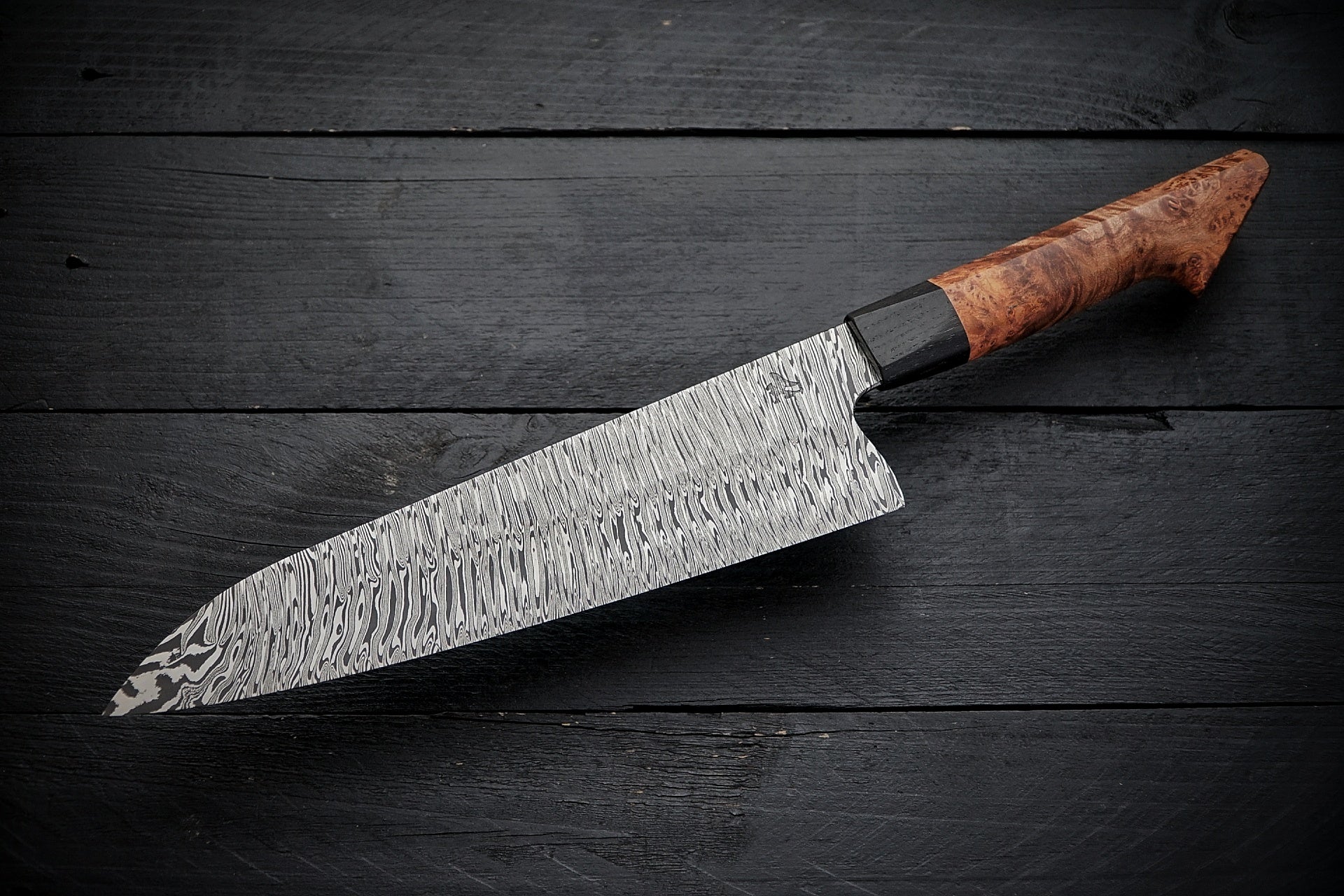 Forged from 1095/15n20 carbon steel in a twisted w pattern damascus. High polished finish on the steel for extra contrast. Carbon steel holds a very fine durable edge but will patina and should be dry stored when not in use. The gyuto style blade is great for covering most tasks in the kitchen and features a concave “S-grind” to reduce surface area and improve food release. The handle wood has been stabilized in a resin to resist moisture and increase durability.