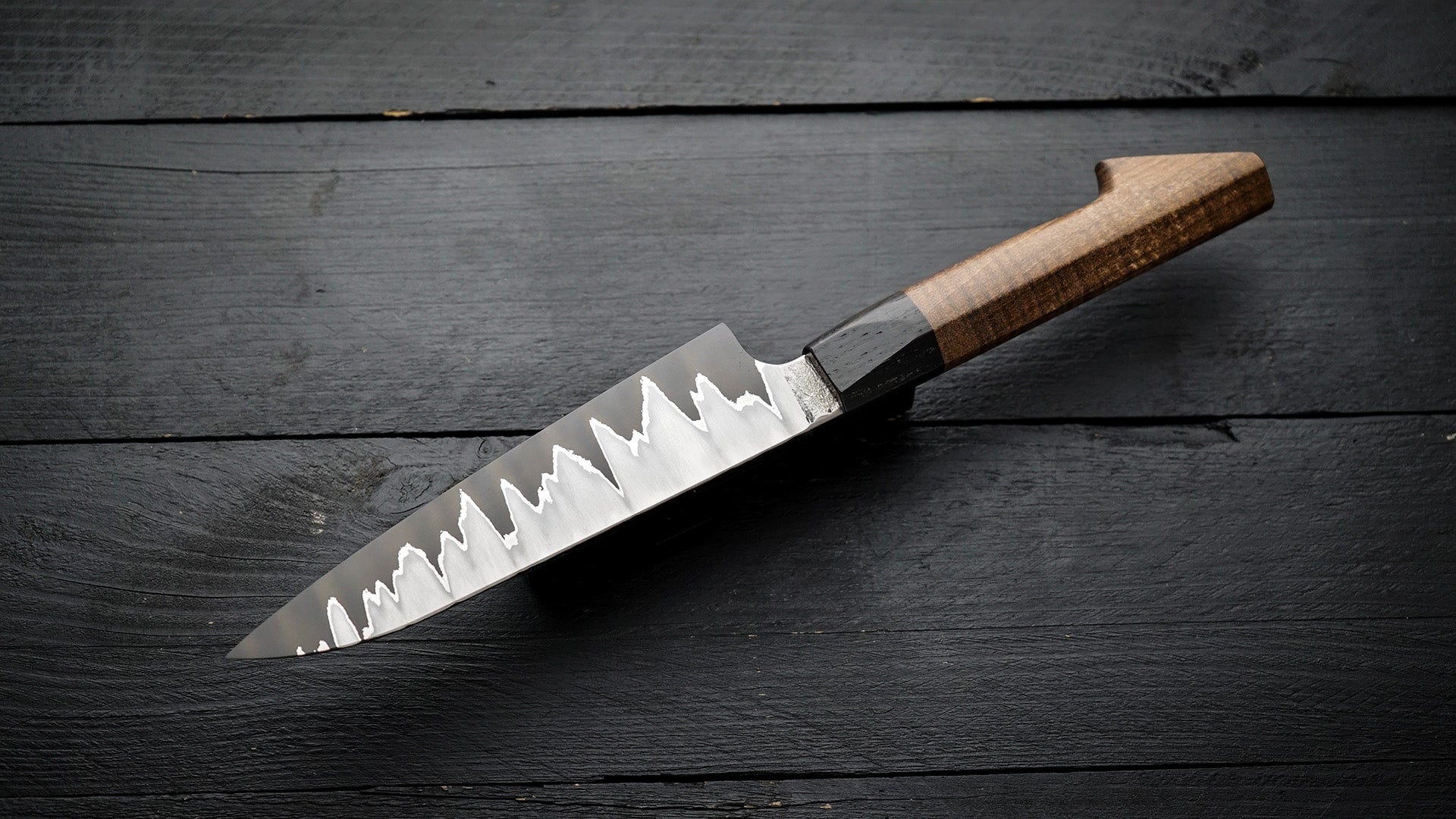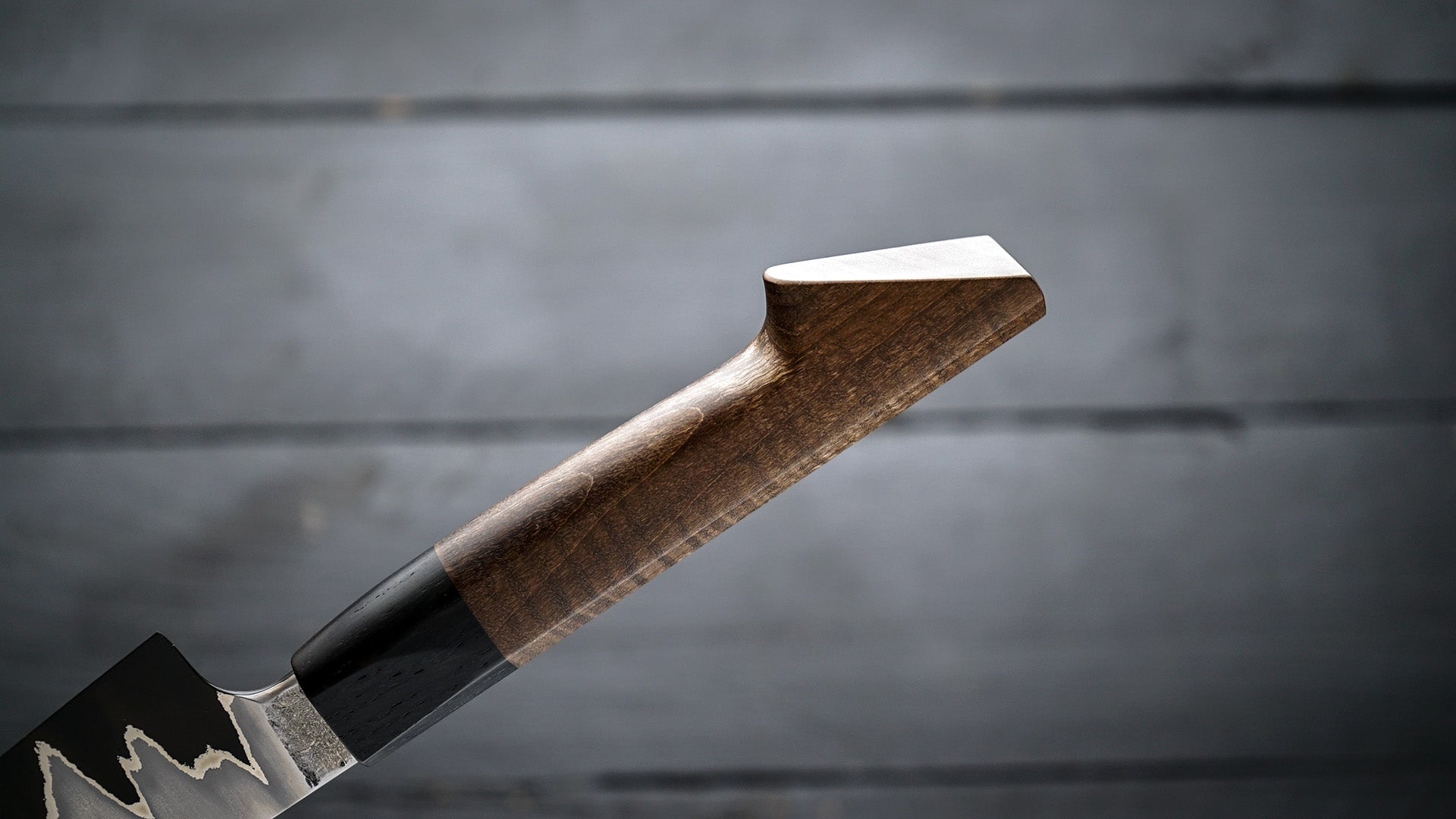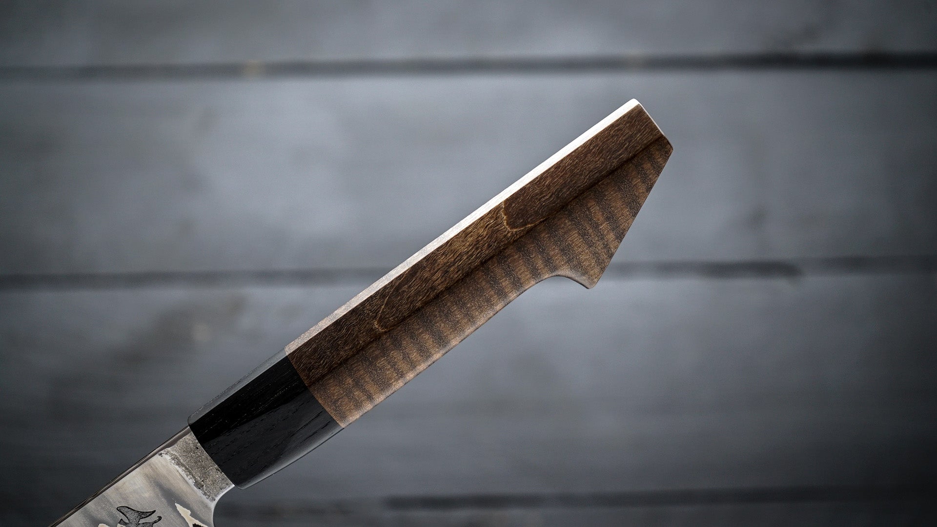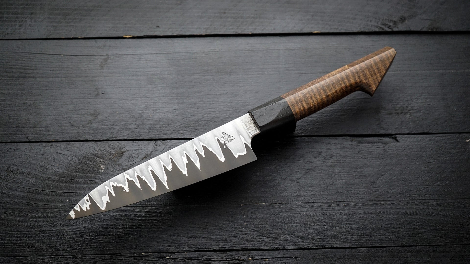 Forged from 52100 carbon steel for the cutting edge with stainless/nickel cladding. 52100 is used to manufacture industrial cutters, automotive and aircraft components as it has great toughness and durability. Carbon steel holds a very fine durable edge but will patina and should be dry stored when not in use. The petty style blade is great for a wide range of small tasks in the kitchen with a more light and nimble feel. The handle wood has been stabilized in a resin to resist moisture and increase durability.